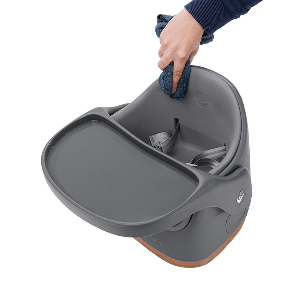 A bandeja ajustável em duas posições se adapta ao crescimento do bebê e pode ser removida facilmente para facilitar a limpeza.