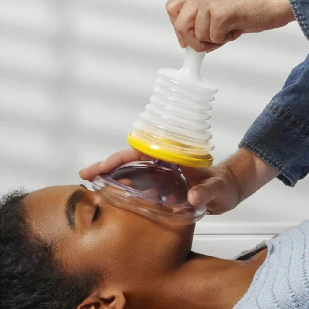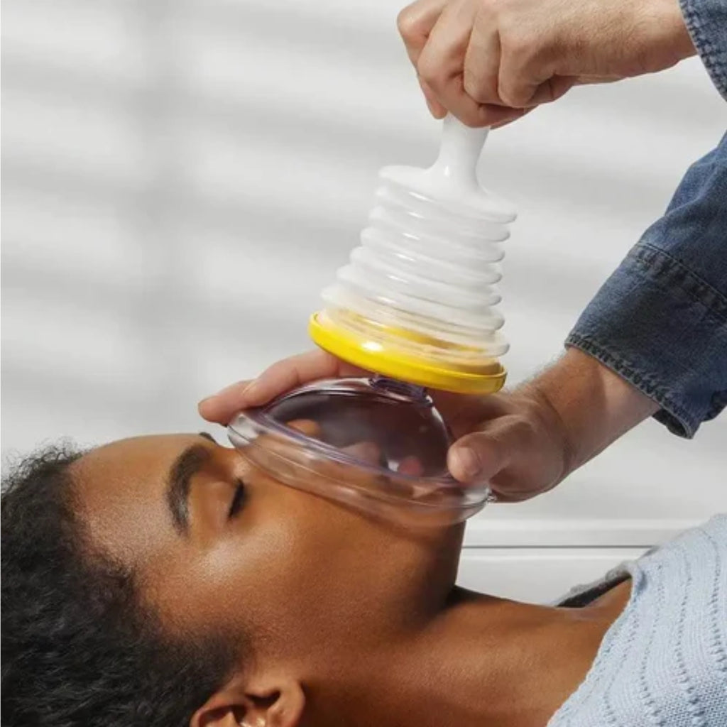 Basta encaixar a máscara e acionar o pistão, qualquer pessoa, mesmo sem treinamento médico, consegue aplicar o LifeVac de forma rápida e eficaz.