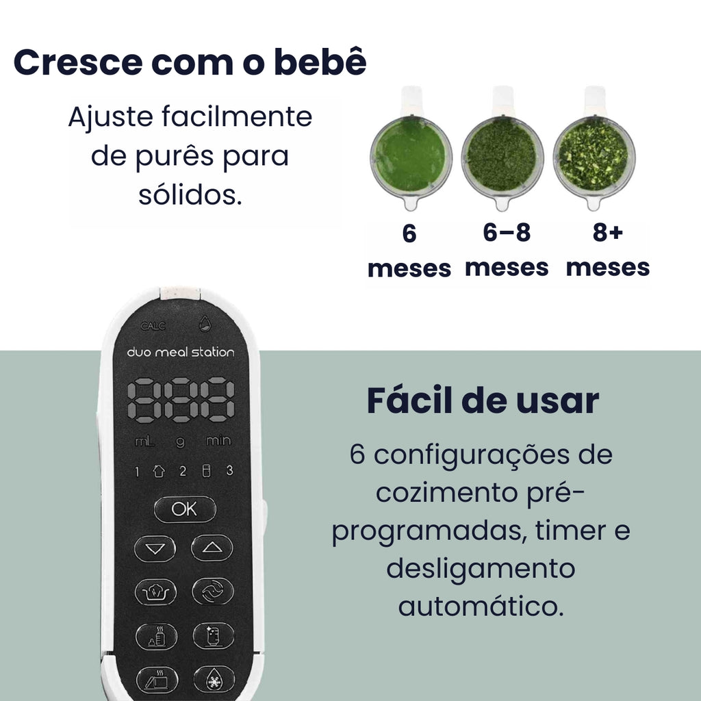 O Duo Meal Station da Babymoov foi desenvolvido para pais que desejam oferecer refeições frescas, saborosas e nutritivas para o bebê com praticidade e segurança. Com sistema de cocção inteligente a vapor e múltiplas funcionalidades em um único equipamento, ele facilita o preparo de papinhas, refeições evolutivas e até o aquecimento de mamadeiras, tudo de forma simples e intuitiva. Um verdadeiro aliado da cozinha moderna dos pais.