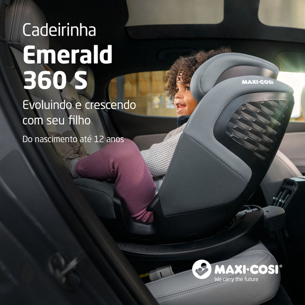 A Cadeirinha Emerald 360 S Maxi-Cosi foi desenvolvida para acompanhar a criança desde o nascimento até aproximadamente 12 anos (150 cm), oferecendo segurança avançada, conforto contínuo e praticidade no dia a dia. Com rotação FlexiSpin 360° com uma só mão, proteção lateral G-CELL e homologação i-Size, é uma solução completa para todas as fases da infância.