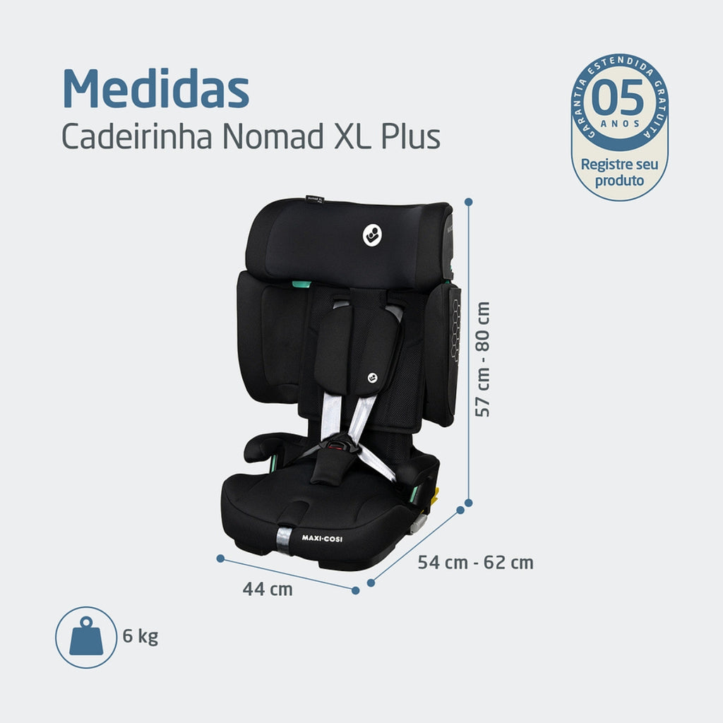A Cadeirinha Nomad XL Plus Maxi-Cosi foi desenvolvida para acompanhar a criança em todas as fases da infância, oferecendo segurança avançada, conforto e praticidade em cada trajeto. Indicada dos 15 meses até aproximadamente 12 anos (de 76 a 150 cm), ela combina design compacto, tecnologia de proteção e ajustes precisos para crescer junto com a criança, atendendo às exigências da norma i-Size R129/04.
