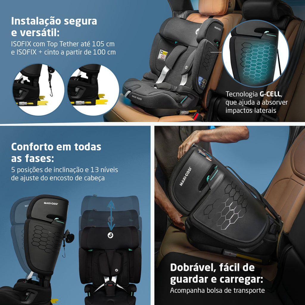 Projetada como uma cadeirinha multi-idade, acompanha o crescimento desde os primeiros passeios após o bebê conforto até a fase de booster, evitando trocas frequentes de cadeira.