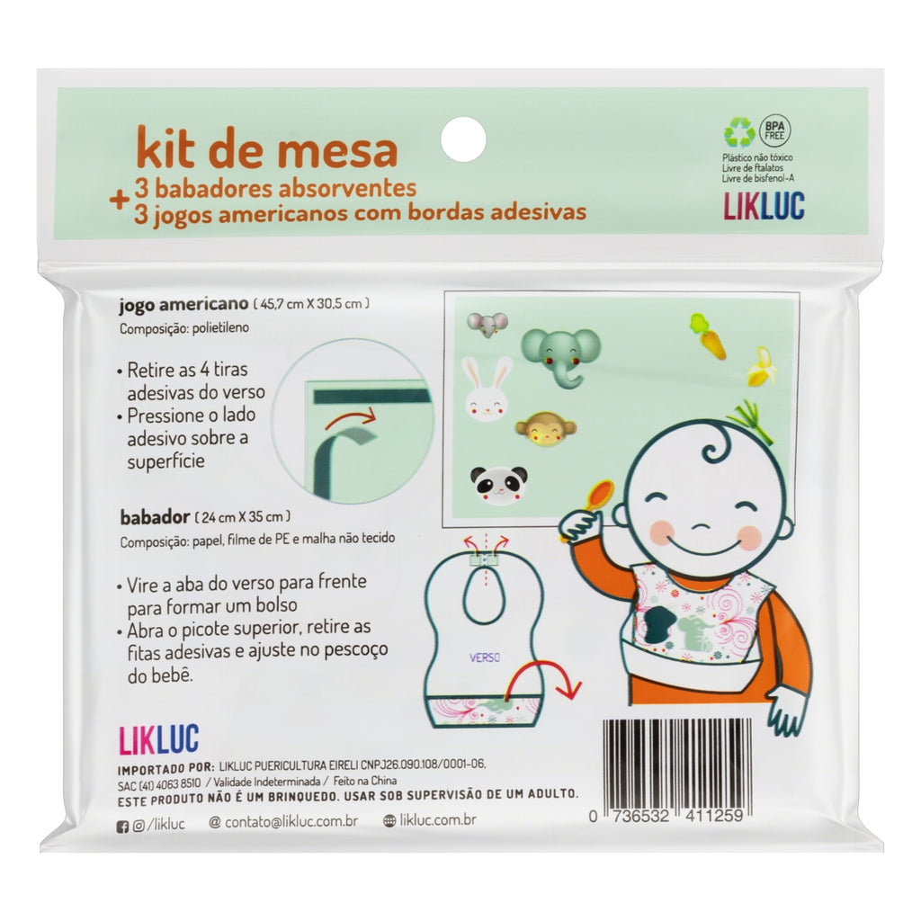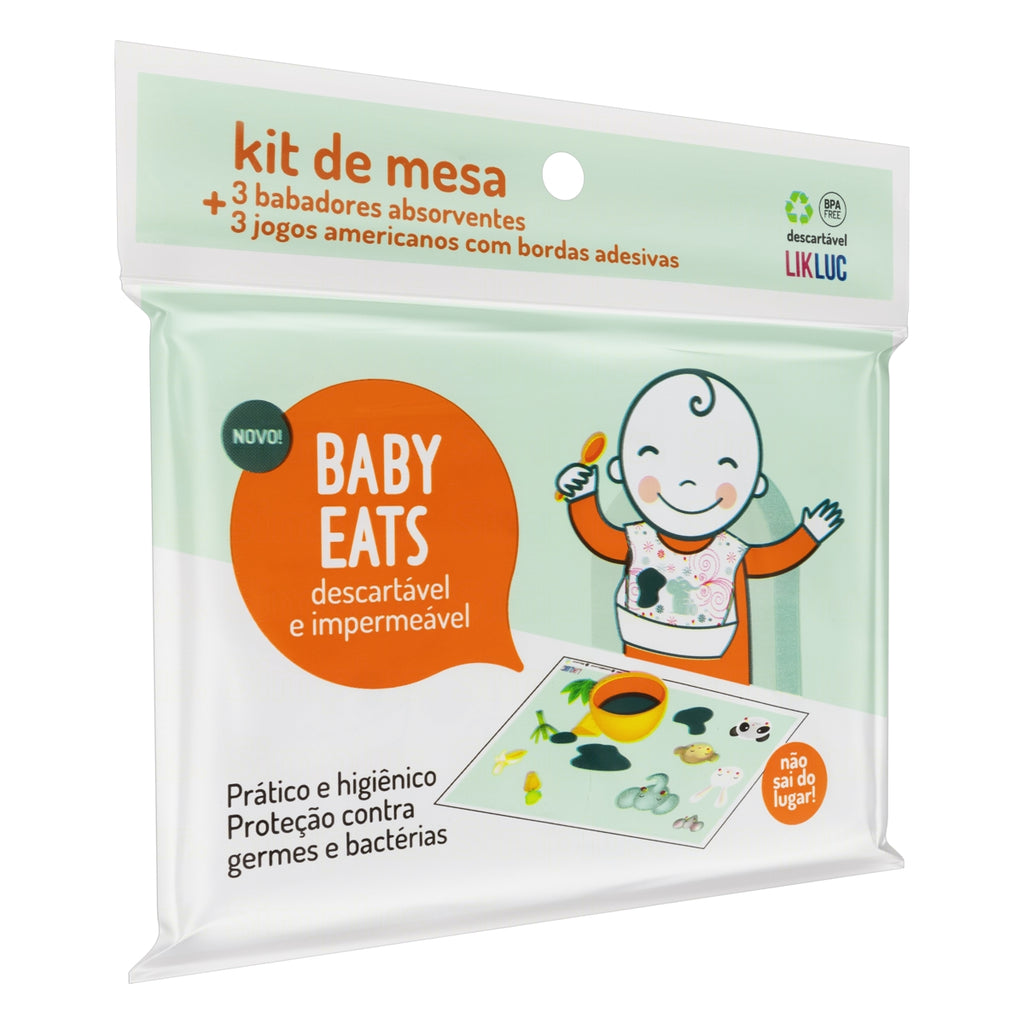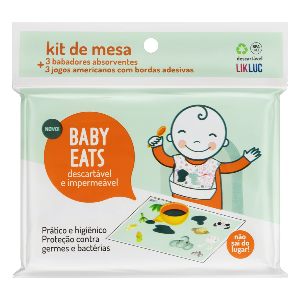 O Kit de Mesa Babador + Jogo Americano Descartável Baby Eats Likluc foi desenvolvido para tornar o momento das refeições mais higiênico, seguro e divertido.