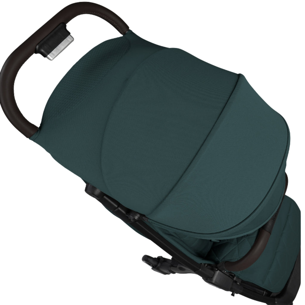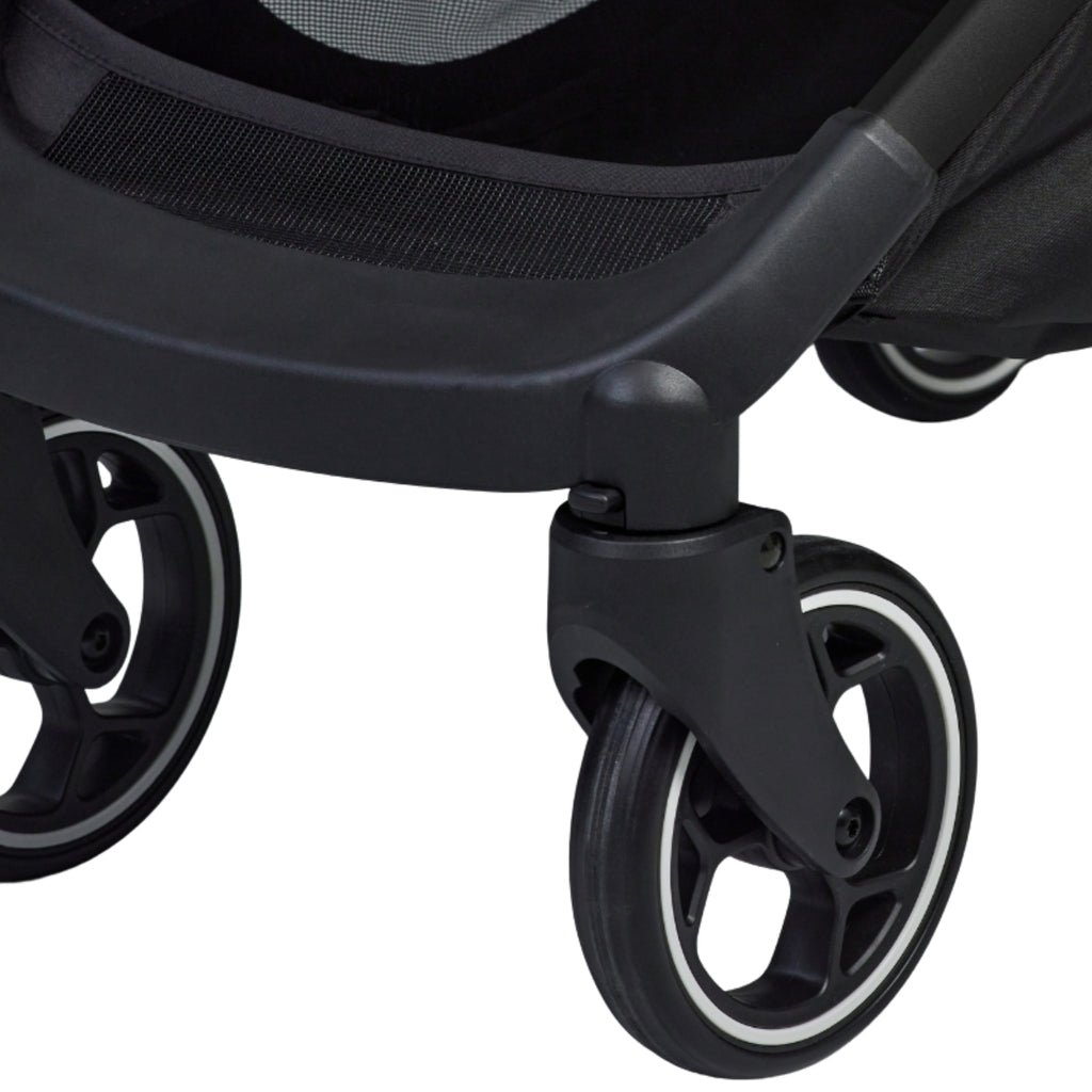 Capota UPF50+ com visor, fivela magnética Genius™, apoio de pernas ajustável, tecidos anti-amassado e rodas robustas para um passeio suave e seguro.