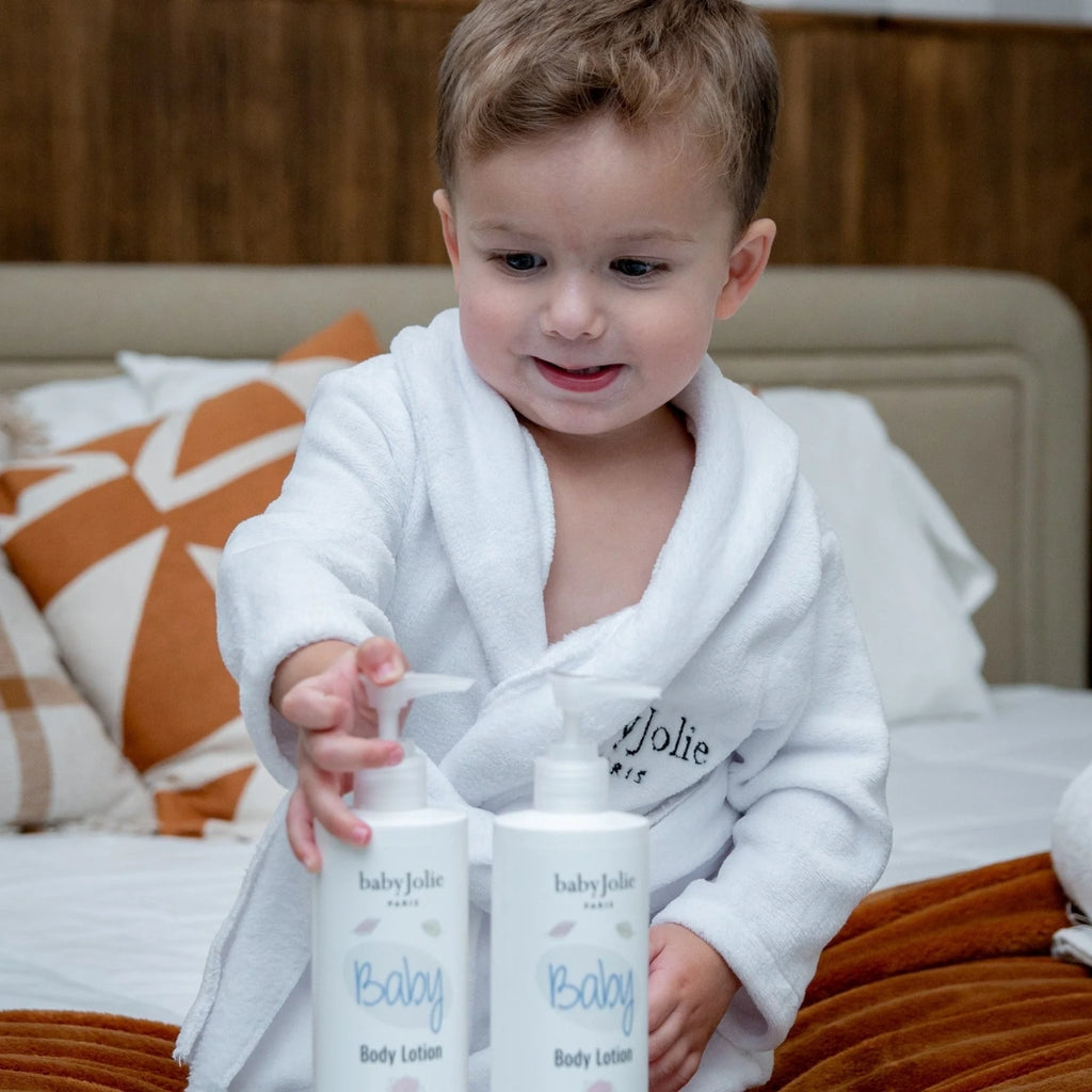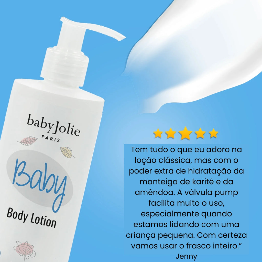 COMO USAR: Bombeie uma pequena quantidade de Loção Corporal Baby Jolie na sua mão usando o dispensador de bomba (concebido para fornecer com precisão a quantidade certa). Aplique suavemente no corpo inteiro do seu bebê.