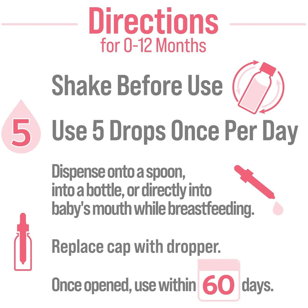 - Use 5 gotas uma vez por dia. Dispensar diretamente na boca do bebê, mamadeira ou durante a amamentação. Agite antes de usar. Depois de aberto, use no prazo de 60 dias.