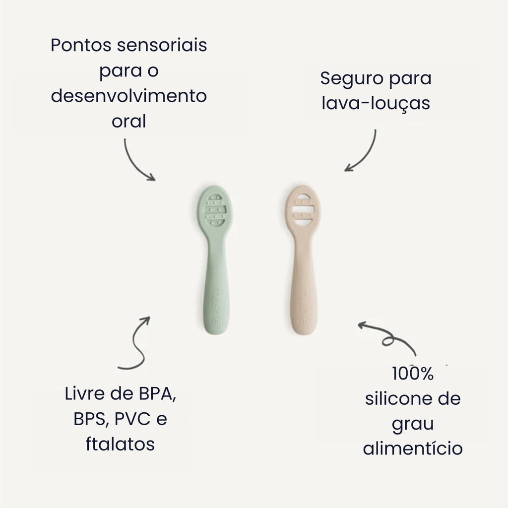 O design plano garante que as colheres possam ser usadas de qualquer lado, sem a necessidade de girar o pulso, ideal para bebês que estão aprendendo a se alimentar sozinhos.